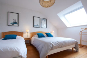 - A l’étage, une chambre : un couchage double de 140 x 190 & un couchage simple de 90 x 190, penderie et placard de rangement